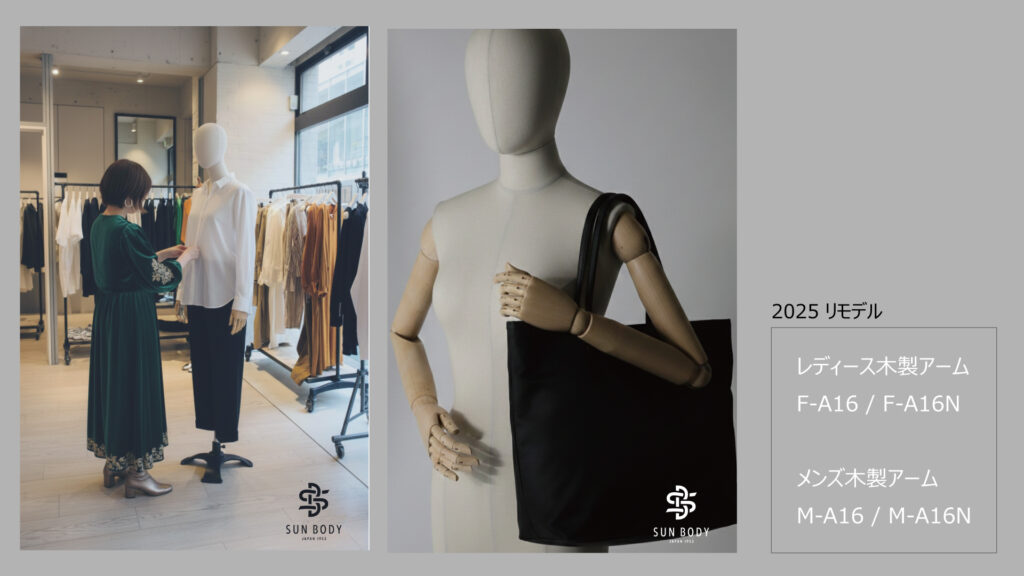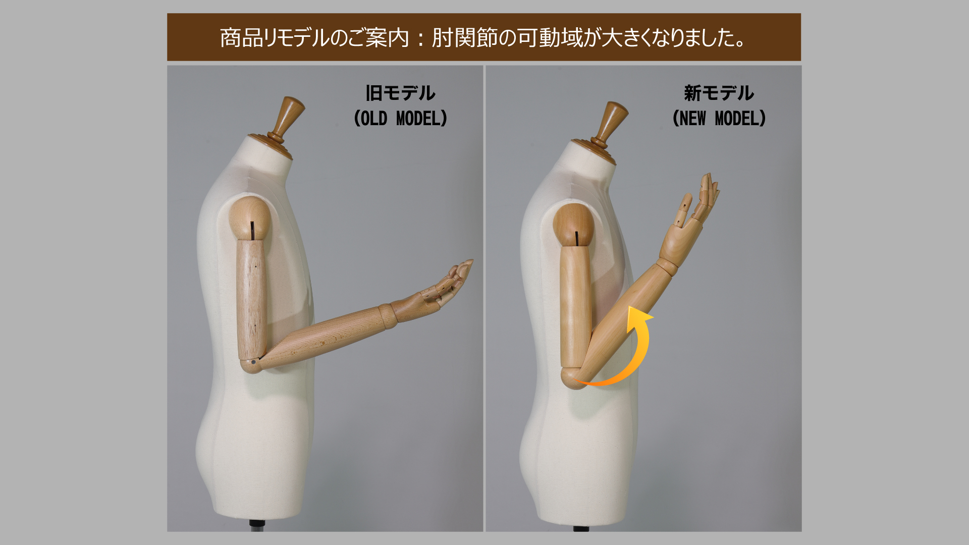今回のリニューアルでは、肘関節の可動域を大きく広げることで、より自然でダイナミックなポージングが可能になりました。これにより、お客様の表現の幅がさらに広がり、ディスプレイの自由度も格段に向上いたします。