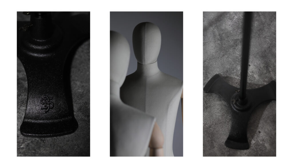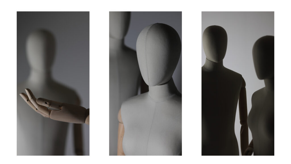タイポグラフィーは装飾を抑えたシンプルな構成とし、あくまで主役(洋服)を支えるマネキンの役割とも重なり、ブランドの世界観を表します。